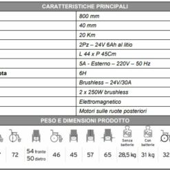 La carrozzina è movimentata da due motori brushless da 250W con freno elettromagnetico, alimentati da due batterie al litio estraibili da 24V 6Ah con indicatore di carica.
