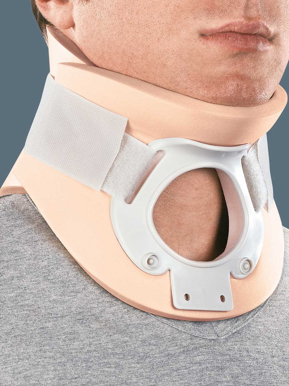 Struttura costituita da due valveavvolgenti con chiusure a Velcro®, Struttura in materiale polimericoespanso non citotossico secondo lanorma UNI EN ISO 10993-5, Placche rigide di rinforzo centraleanteriore e posteriore, Radiotrasparente e impermeabile, Sagomato per una perfetta aderenza almento, alla nuca ed alle spalle, Foro tracheale e fori per l'aerazione, Predisposto per essere collegato o allostabilizzatore toracico o all'iperestensore |