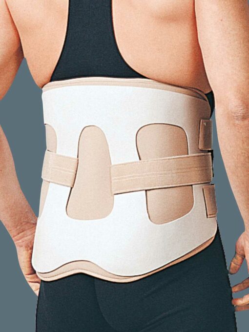 Struttura in materiale plastico KYDEX®, Due sezioni: lombosacrale e addominale, Cinture di congiunzione con chiusurea Velcro®, Pannelli di morbido accoppiato abbinatialla struttura rigida |