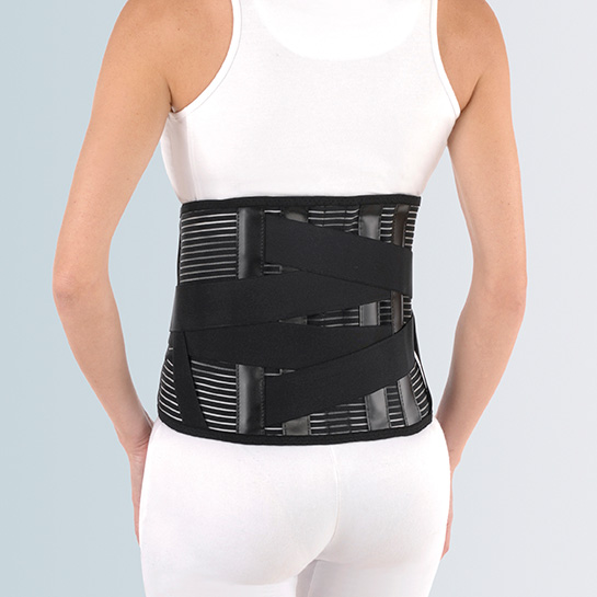 Coadiuvante nel trattamento degli stati patologici di natura ortopedica del tronco.STRUTTURA:tessuto elastico millerighe semirigido traspirante.TIRANTI:due fasce elastiche che dalla steccatura posteriore si incrociano e si agganciano anteriormente in un unico tirante.STECCATURA:4 stecche posteriori in acciaio automodellante non removibili.CHIUSURA ANTERIORE:a strappo |
