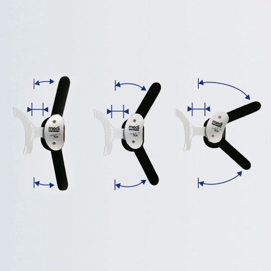Lo snodo policentrico Physioglide di questa ginocchiera con sistema di stabilizzazione rotuleo ad avanzamento fisiologico, regolabile tramite stop, garantisce una supporto personalizzato.