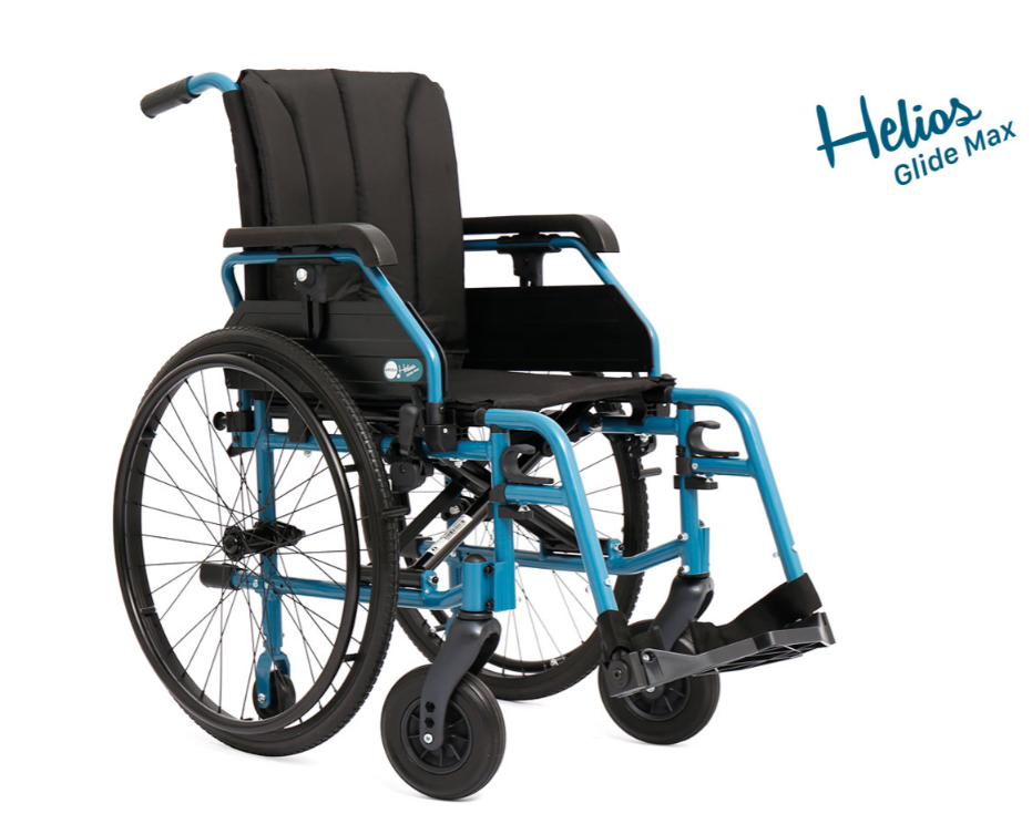Infine, le pedane ribaltabili, estraibili e regolabili in lunghezza, complete di cinturini ferma tallone e poggiapiedi regolabili, rendono la Helios Glide Max una carrozzina versatile, indicata per utenti con esigenze differenti e disponibile in più misure di seduta.