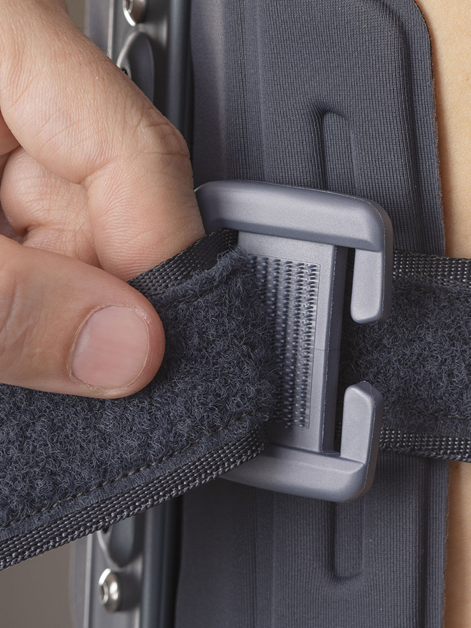 La banda pelvica basculante e telescopica, dotata di parti terminali flessibili in polimero resistente, si adatta ottimamente all'anatomia del paziente.