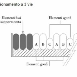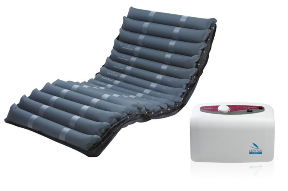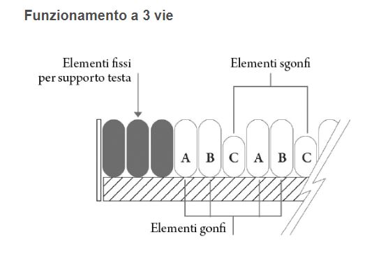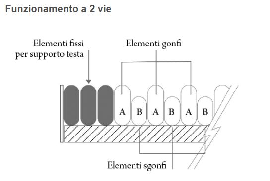 Materasso indicato per la prevenzione ed il trattamento delle piaghe da decubito fino al III STADIO. I primi tre a funzionamento statico per la testa; la restante parte è divisa in 2 sezioni a funzionamento alternato a 2 o 3 vie; completo di coperta in Nylon/PU traspirante ed impermeabile fissata per mezzo zip. Fissaggio del materasso al letto tramite cinghie in dotazione e dotato di occhielli passacavo. Il compressore con regolazione di pressione, allarme visivo e sonoro per la bassa pressione e filtro aria intercambiabile. Funzione STATIC che blocca il sistema alternato e lo rende di fatto un normale materasso. Connessione materasso/compressore tramite connettori veloci con chiusura, utilizzabile in caso di trasporto del paziente.