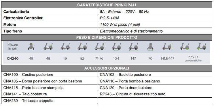 Con una velocità massima di 15 Km/h, un raggio di sterzata di 140 Cm e la capacità di superare pendenze fino al 21%, il Mobility 240 è la scelta ideale per una mobilità sicura e confortevole.