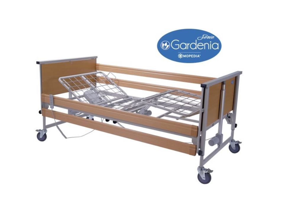 Struttura in tubolare d’acciaio verniciato a polveri. 4 ruote piroettanti da 12,5 cm tutte con freno. Testiera e pediera in legno, sponde in alluminio effetto legno. Supporti per asta sollevamalati ed asta da flebo. Conforme alla norma UNI CEI EN 60601-2-52 dei letti medici.