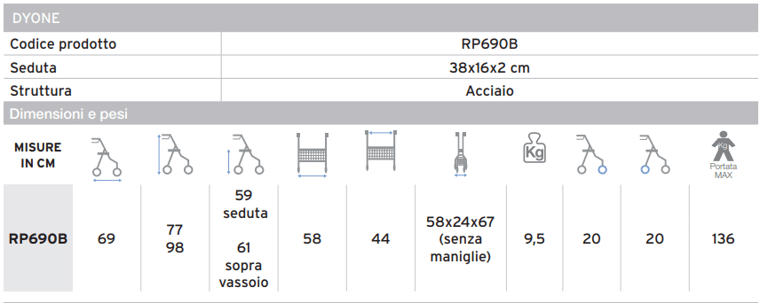 Con un peso massimo supportato di 136 kg, questo rollator è robusto e progettato per un uso intensivo.