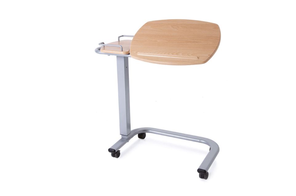 Struttura in acciaio verniciato grigio, con molla per sollevamento automatico. Due piani, di cui uno inclinabile in più posizioni da 24° a 48°, piano in color legno naturale.