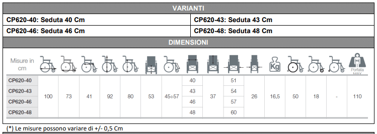 - Larghezza Seduta: 40 cm, 43 cm, 46 cm, 48 cm