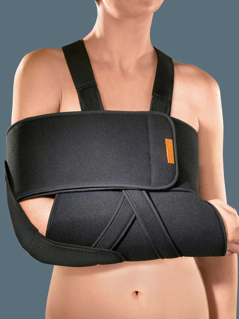 Sacca reggibraccioin tessuto imbottito velcrabile,per il massimo range di regolazione, Morbide bretelle velcrate, Esclusiva fascetta blocca-gomitoin tessuto reticolare, Fascia contenitivain tessuto imbottito velcrabile,per il massimo range di regolazione |