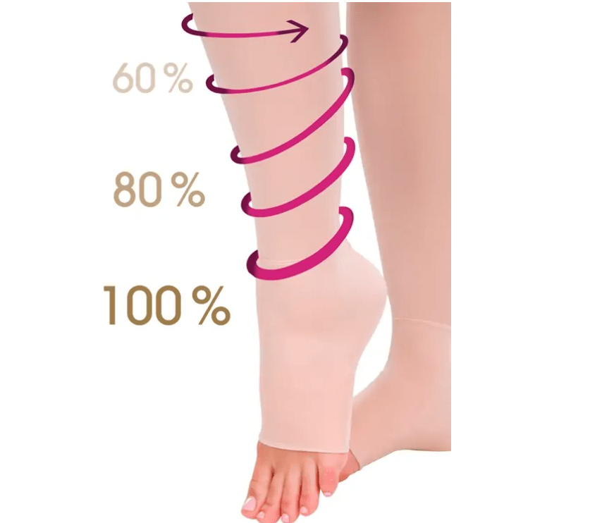 - la compressione viene esercitata in modo decrescente dal basso verso l’alto, ossia dalla caviglia (punto in cui la compressione è più forte) alla coscia (punto in cui la compressione è più lieve)