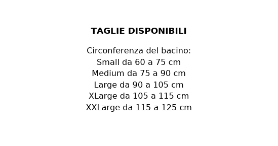 Taglie (circonferenza bacino): S 60–75 cm | M 75–90 cm | L 90–105 cm | XL 105–115 cm | XXL 115–125 cm.