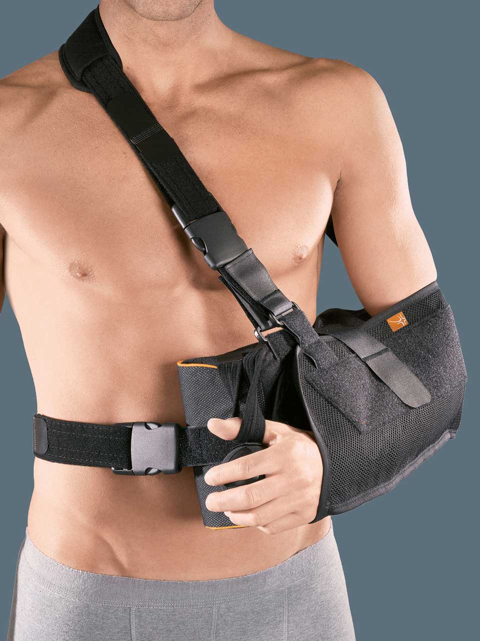 | CARATTERISTICHE | Struttura in gommapiuma ad alta densità ricoperta da tessuto tramato in fibra d'argento a contatto con il corpo, Manicotto a protezione del collo, Rivestimento e manicotti con nylon garzato esterno per attacchi del Velcro®, Tasca reggibraccio in materiale traspirante, Tiranti con fissaggio a fibbie e regolabili a Velcro®, Cinturino di sostegno del pollice, Abduzione a 10° |
