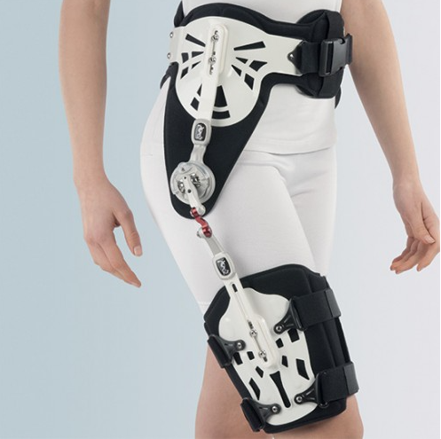 La struttura rigida in alluminio modellabile presenta valve anatomiche per una presa sicura su bacino e coscia, con imbottiture in vellutino grippante per il massimo comfort. Lo snodo regolabile controlla l'abduzione fisiologica con 7 settaggi per flessione, estensione e immobilizzazione.