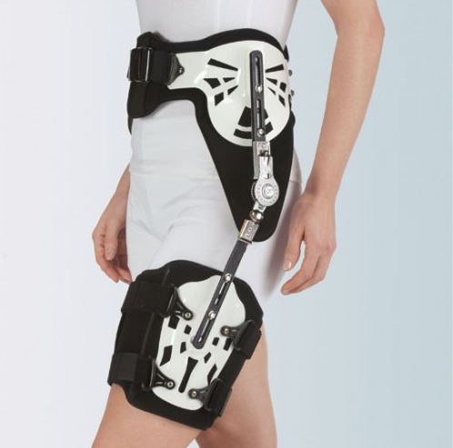 Il dispositivo offre 13 settaggi per la regolazione precisa in flessione, estensione e immobilizzazione. La chiusura della presa bacino avviene mediante fibbia, garantendo una stabilità ottimale, mentre la chiusura della presa coscia è regolabile a strappo per una vestibilità personalizzata.