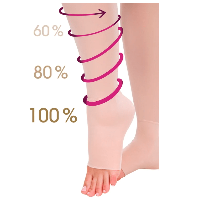- la compressione viene esercitata in modo decrescente dal basso verso l’alto, ossia dalla caviglia (punto in cui la compressione è più forte) alla coscia (punto in cui la compressione è più lieve)